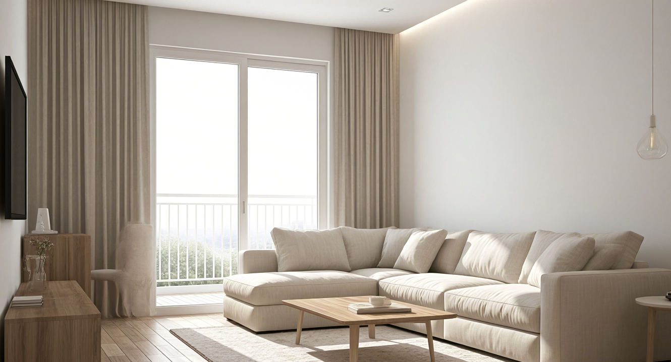 Stylish beige sofa and wooden table illuminated by natural daylight.
