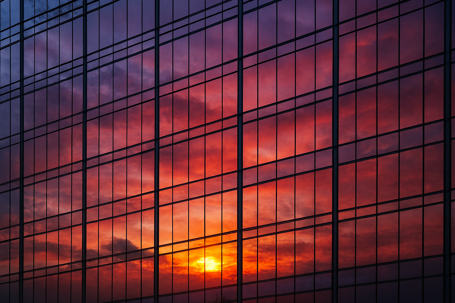 Sunset reflection on modern glass building facade