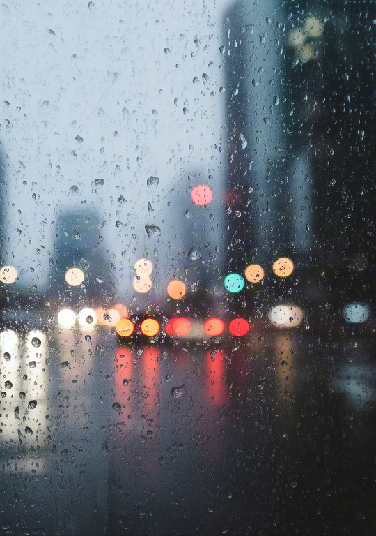 City lights glowing through rainy glass