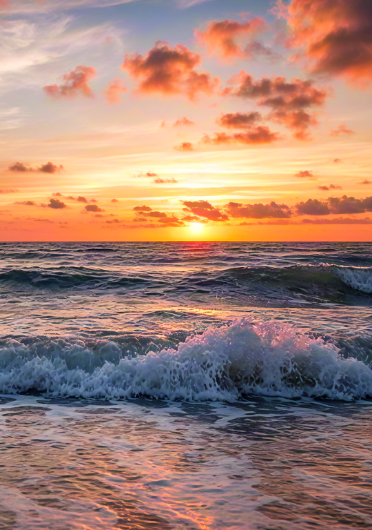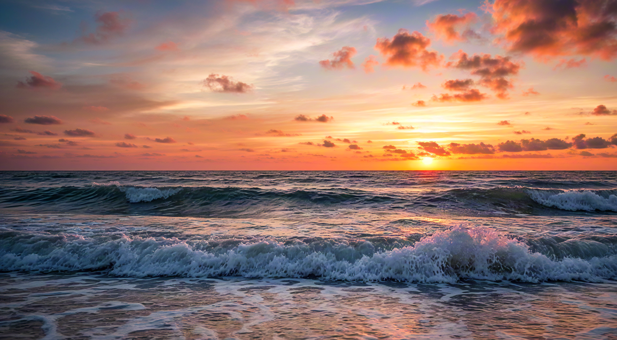 Scenic view of ocean waves rolling under a vibrant sunset sky