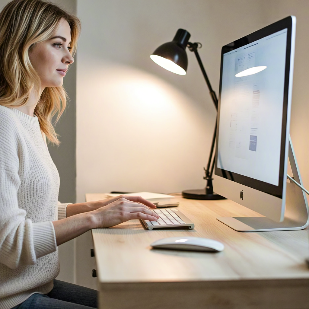 Woman Working at Modern Desktop Workspace