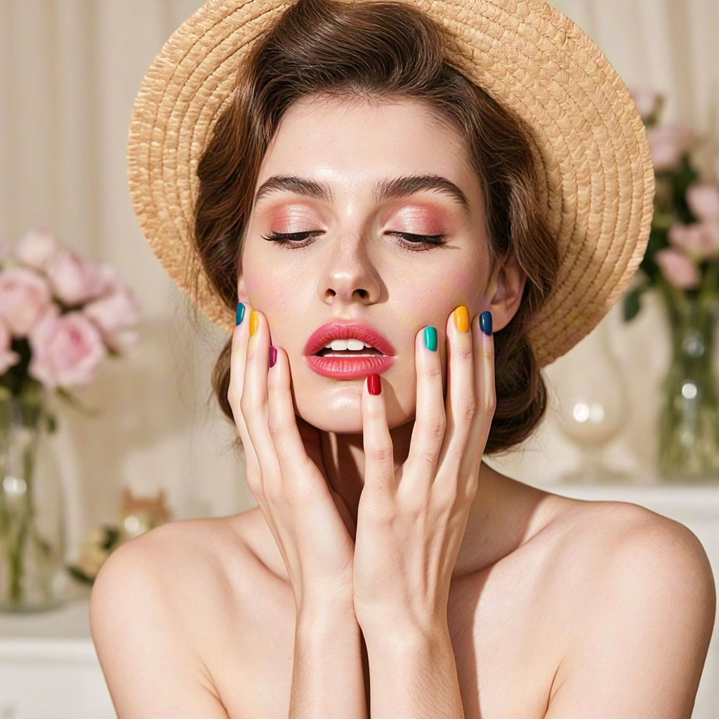 Woman in Straw Hat Posing at Makeup Mirror