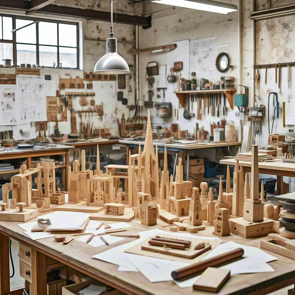 Creative woodworking studio with architectural models – craft and design workspace