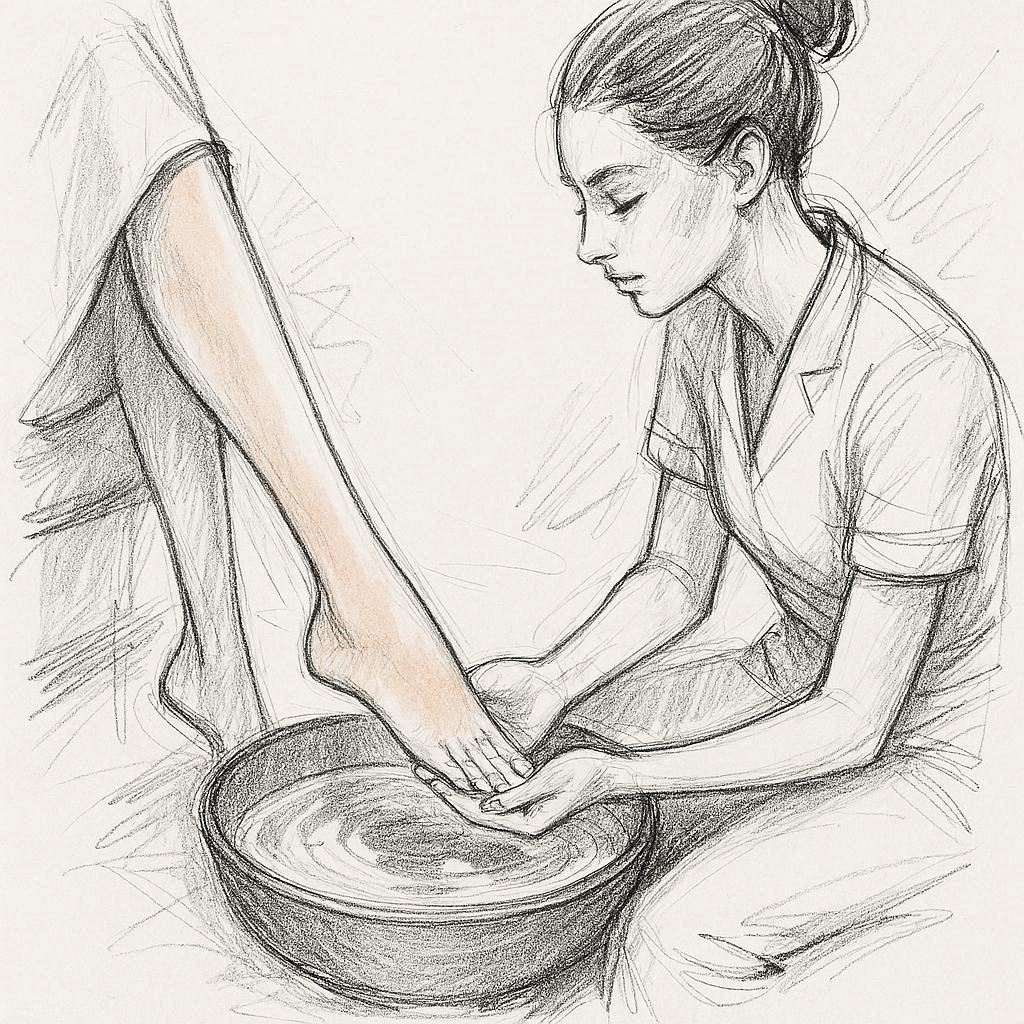 Pencil sketch of woman performing a relaxing foot bath pedicure