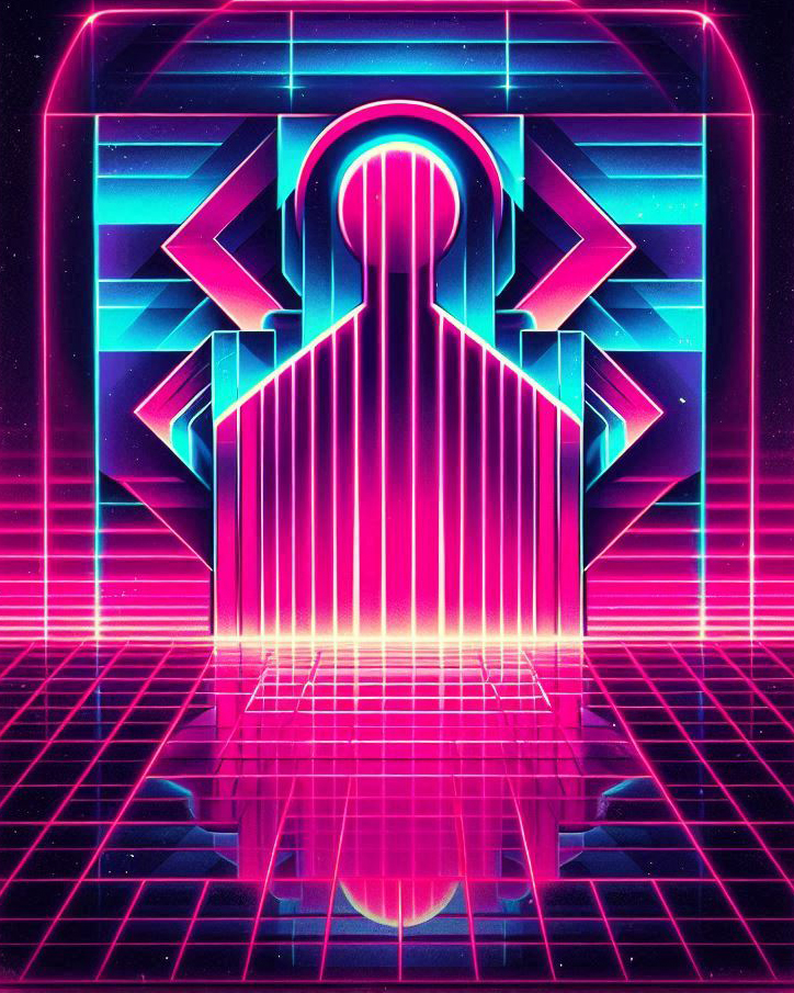 Neon silhouette inside glowing geometric portal in retro-futuristic style
