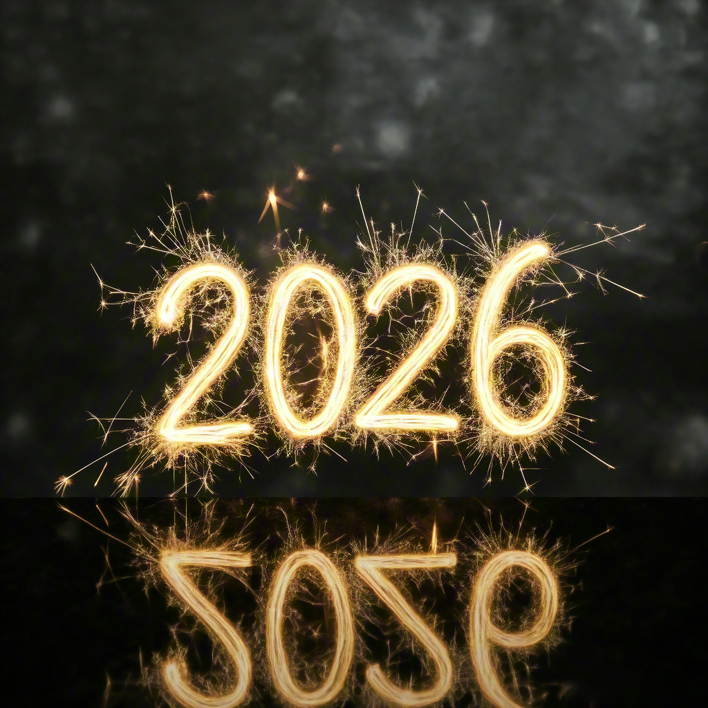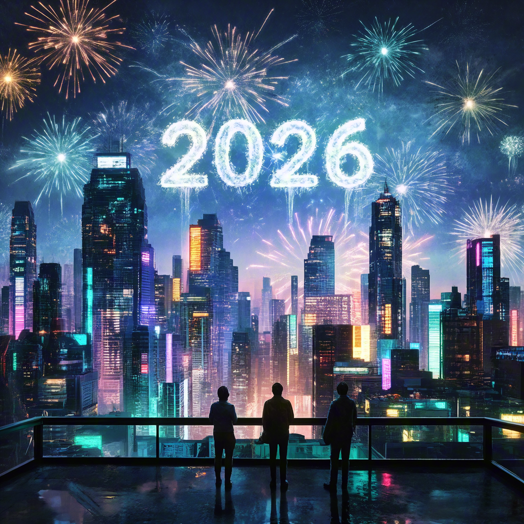 New Year fireworks above modern city skyline with 2026 text Cyberpunk-style