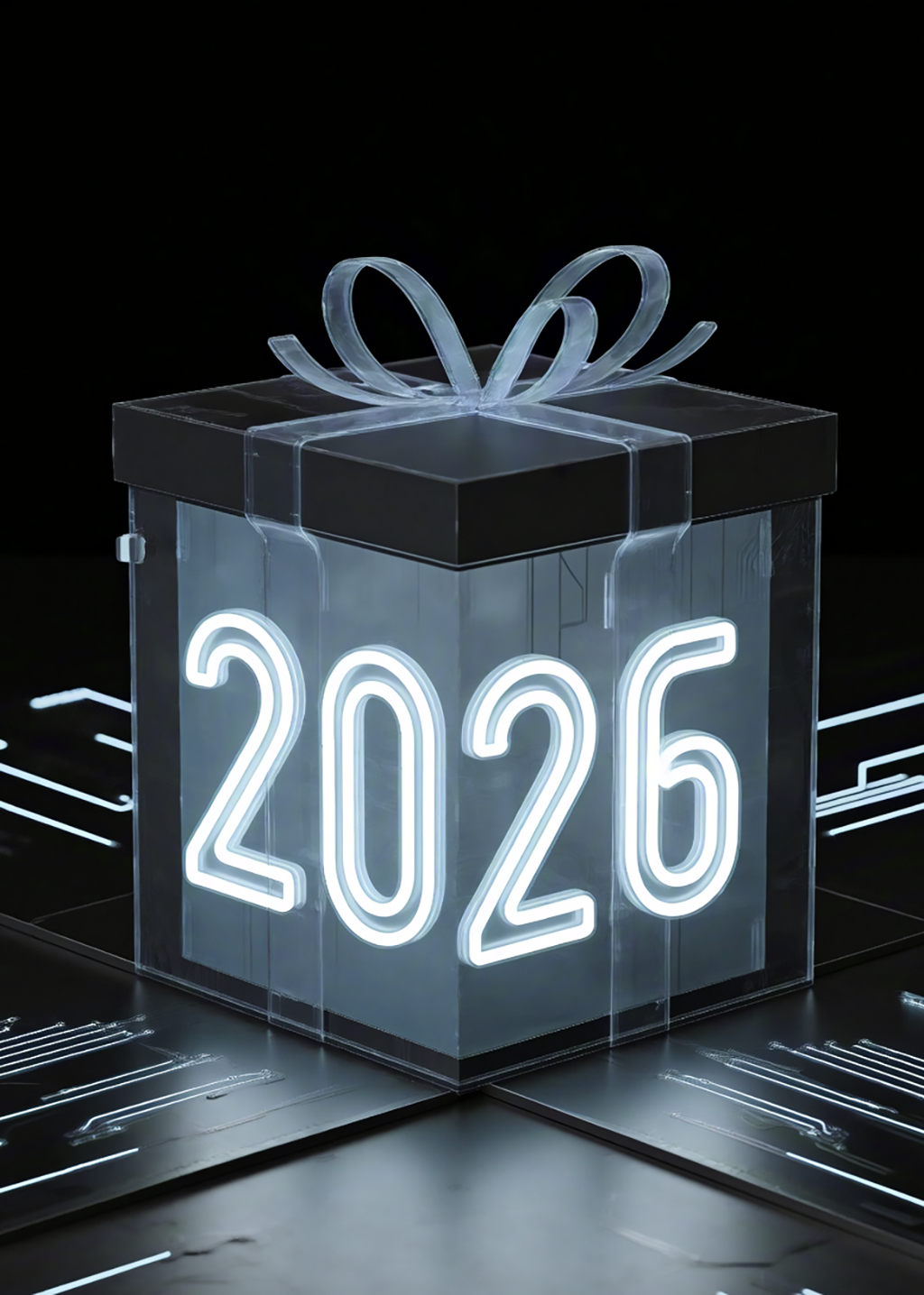 Silhouetted couple standing under glowing purple 2026 lights at night