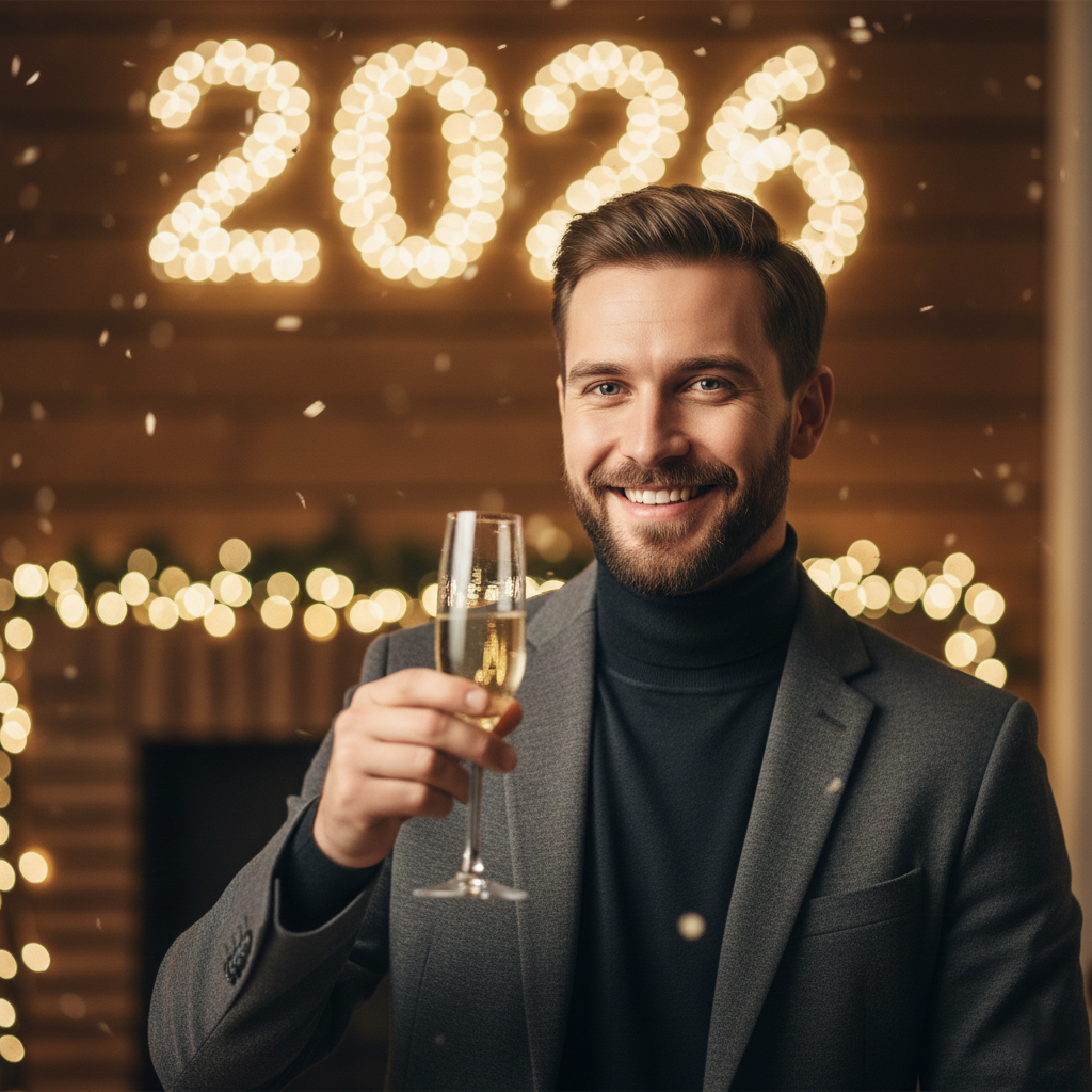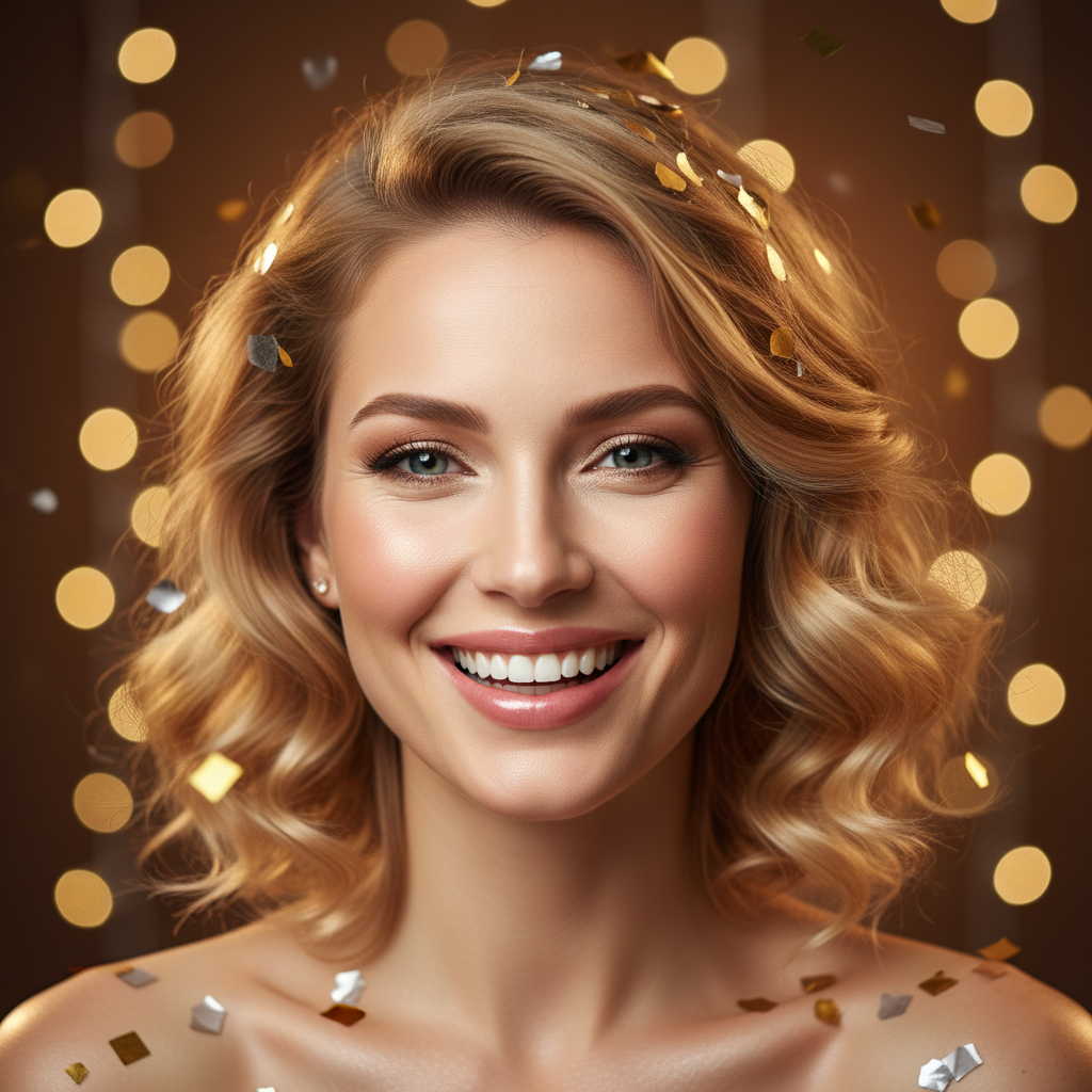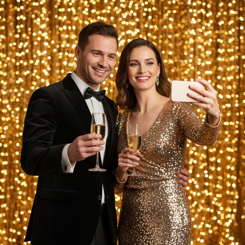 Smiling couple in elegant outfits taking a selfie against golden bokeh