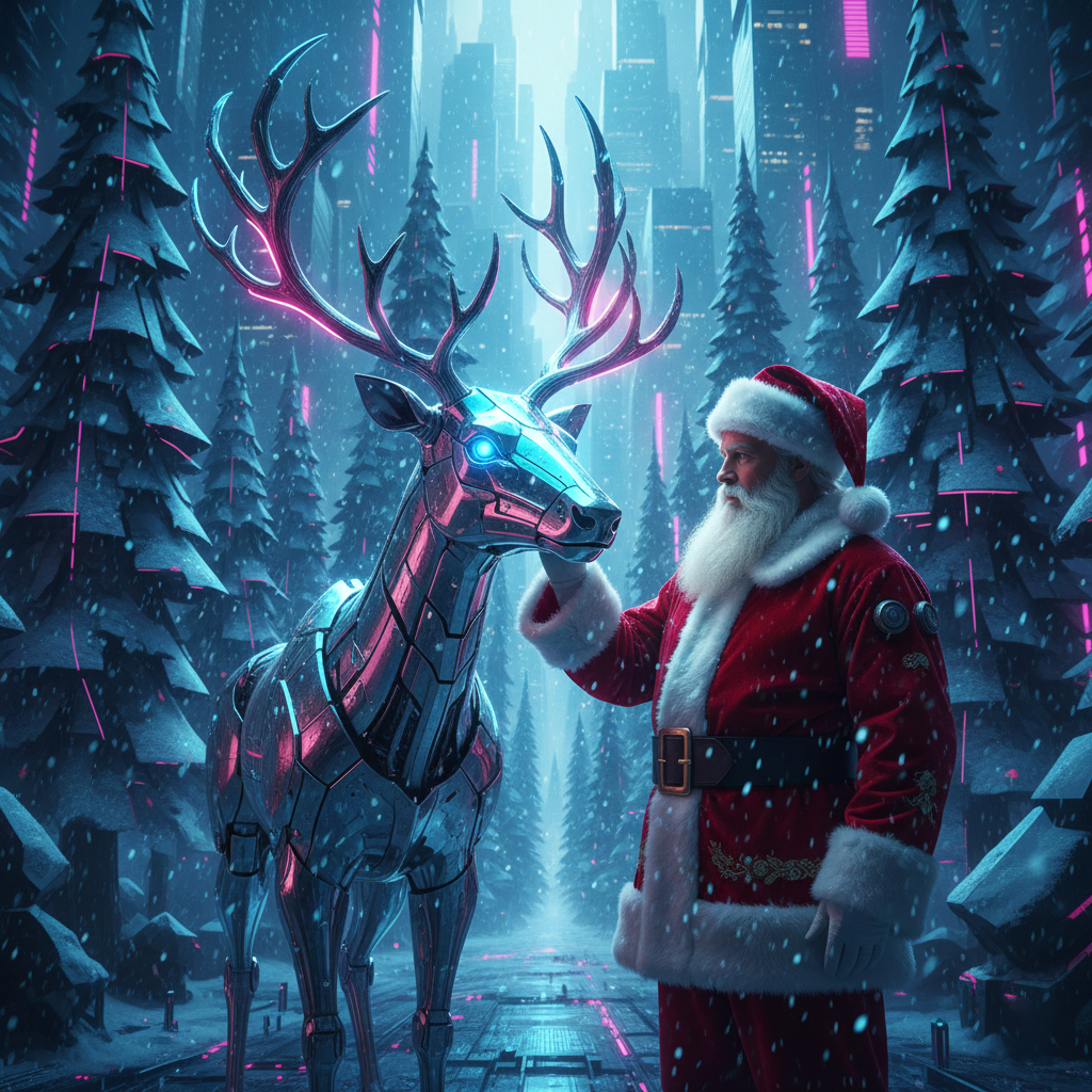 Beautiful reindeer standing in snowy forest with glowing antlers
