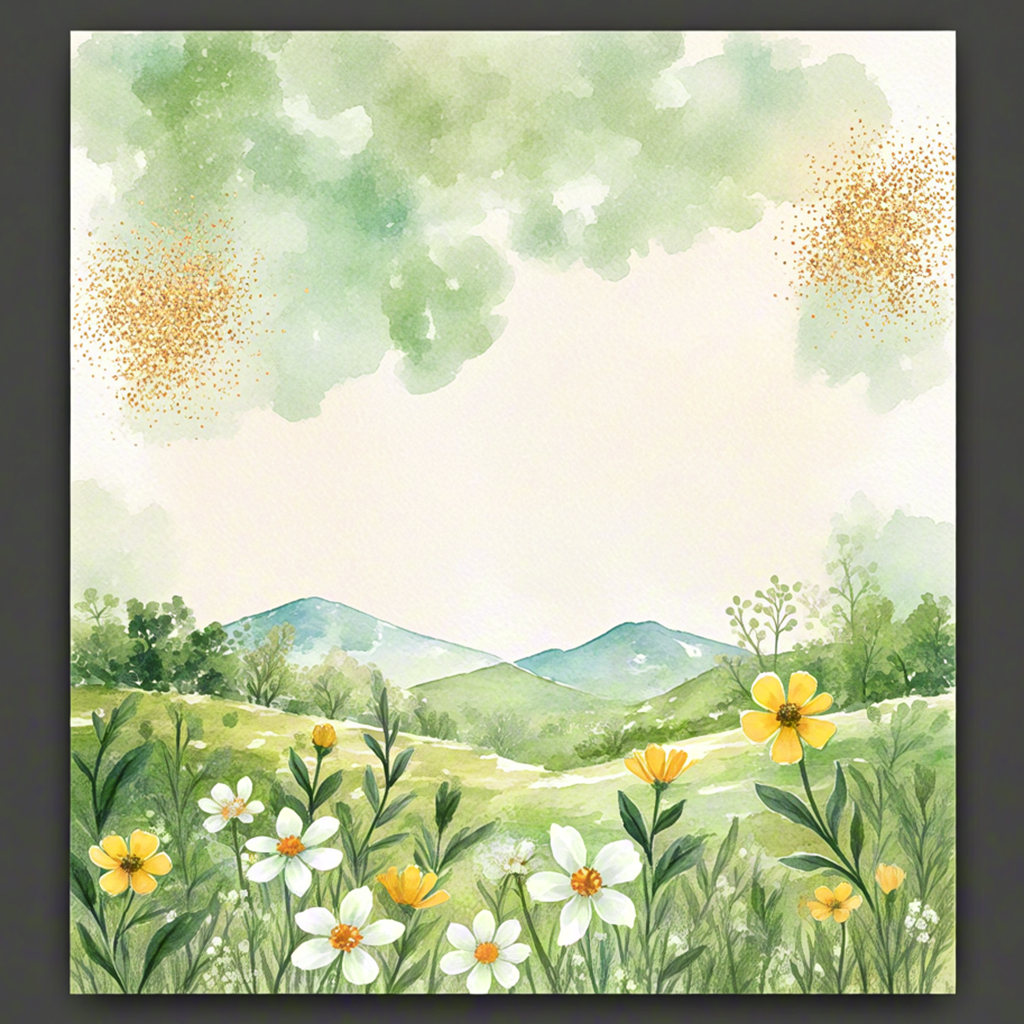 Soft watercolor meadow landscape with flowers and distant hills.