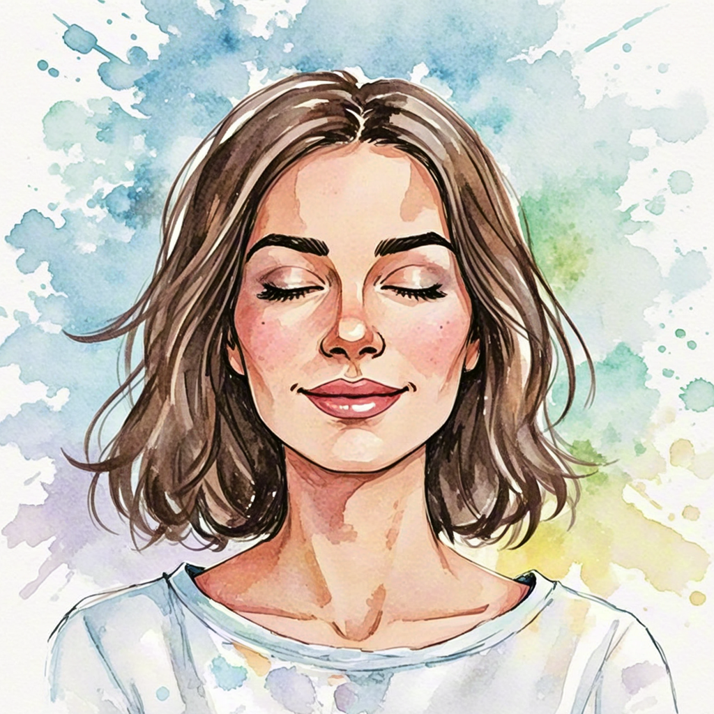 Relaxed young woman in watercolor style with soft background splashes.