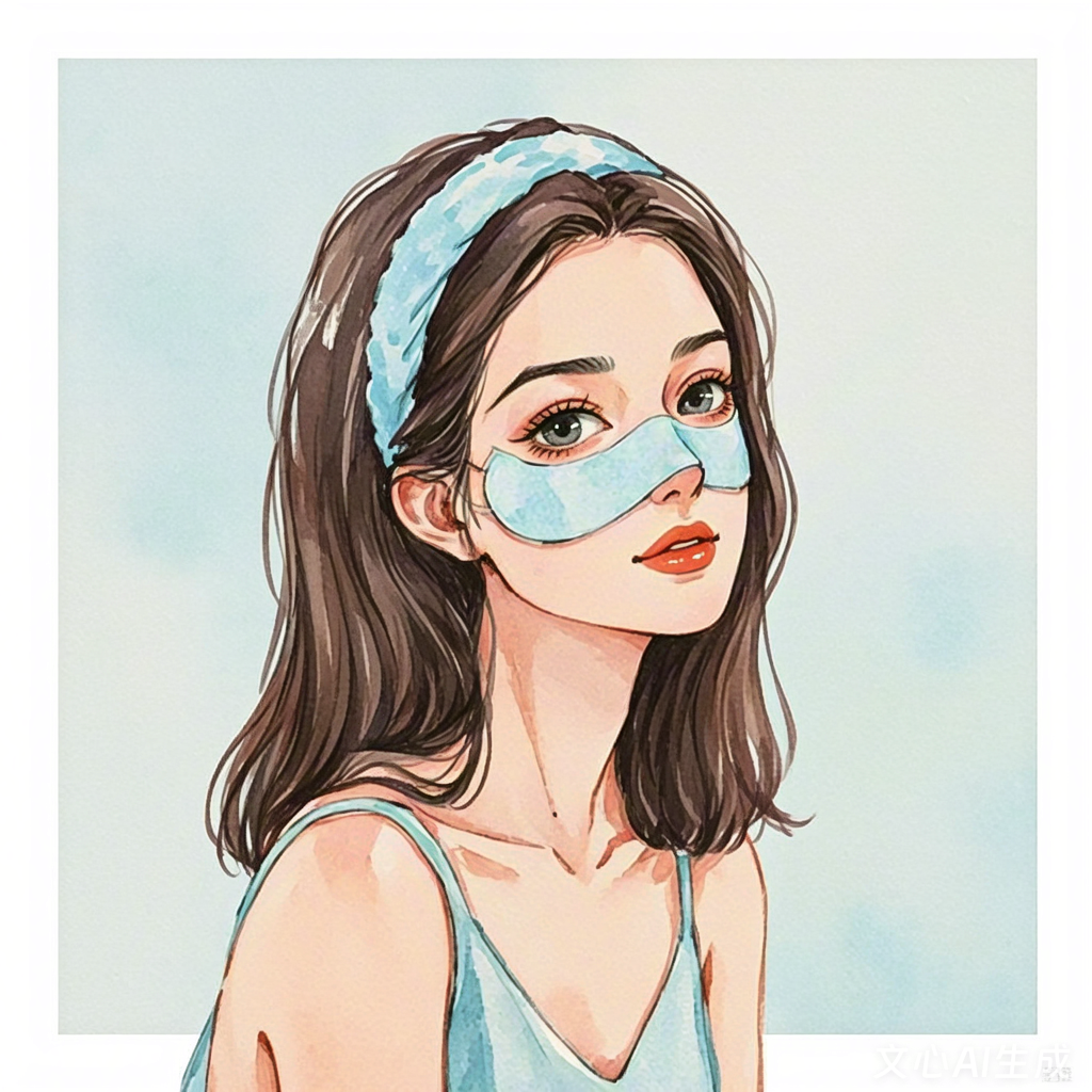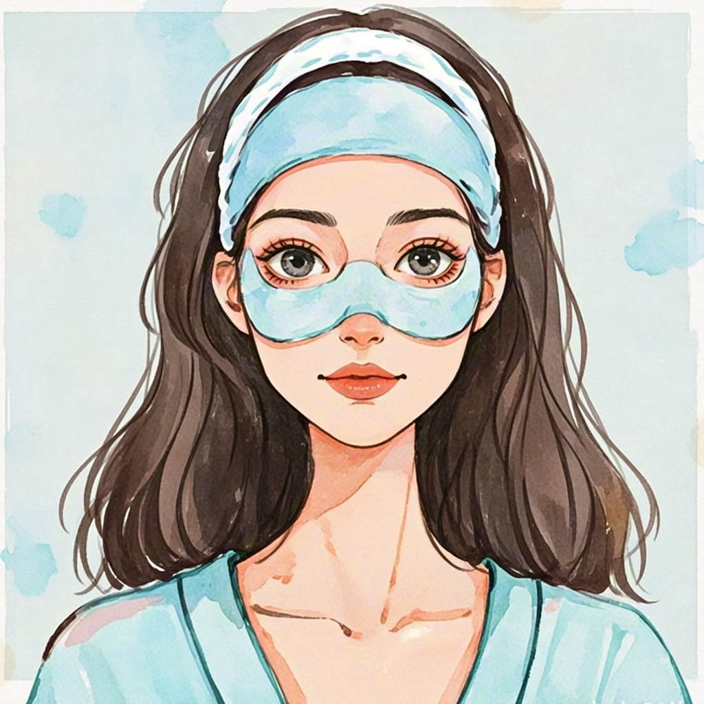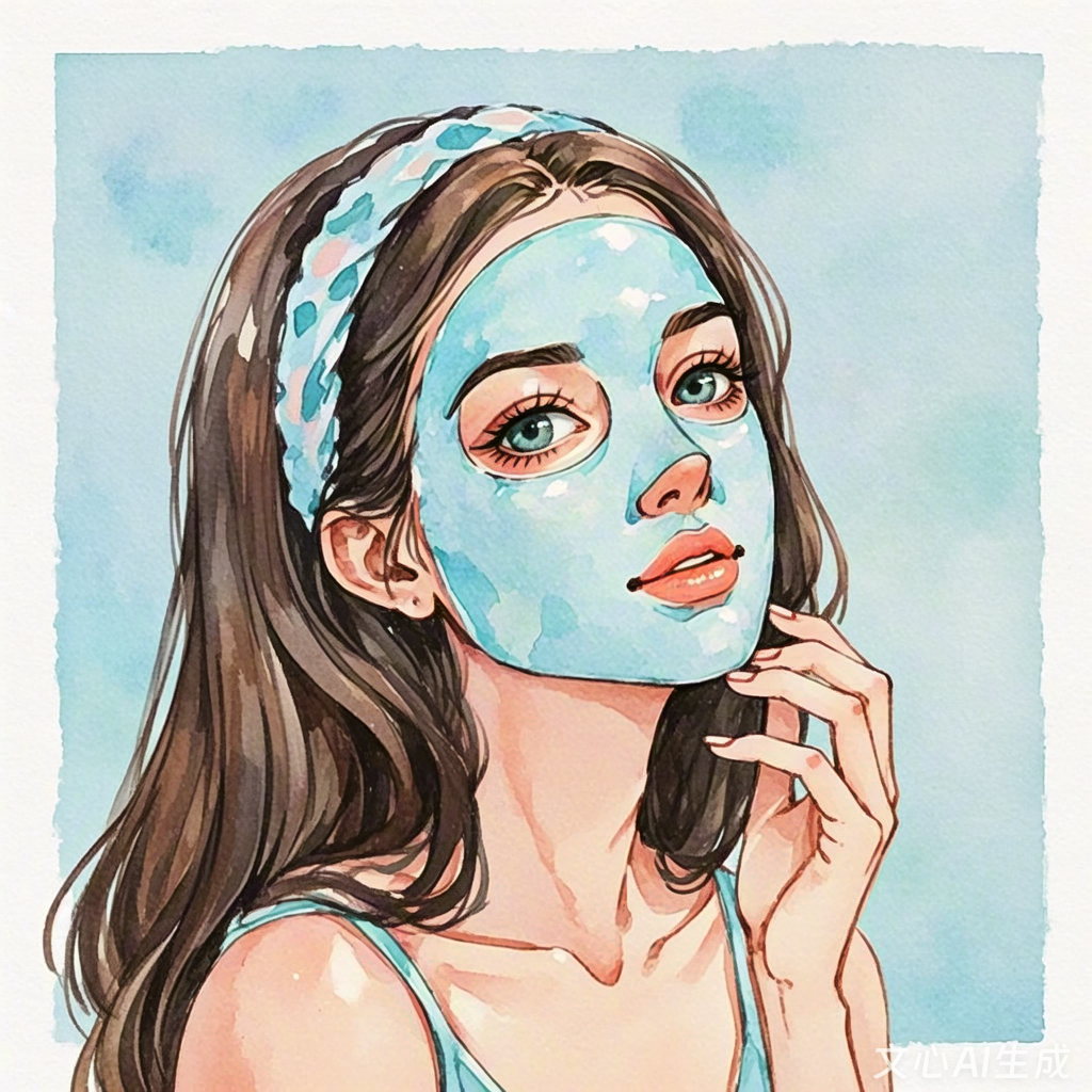 Young woman applying blue facial mask in watercolor illustration.