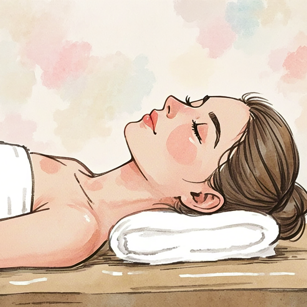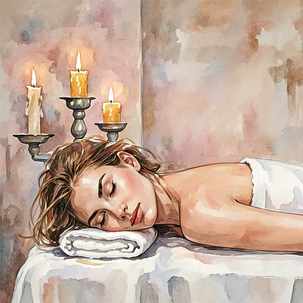 Woman with headband relaxing beside lit spa candles, watercolor style. 17.