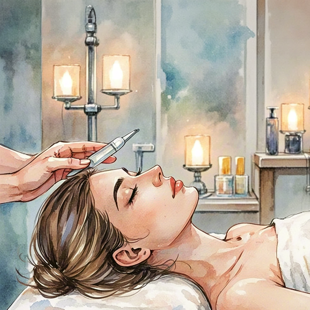 Woman receiving a gentle facial treatment in a cozy spa interior.