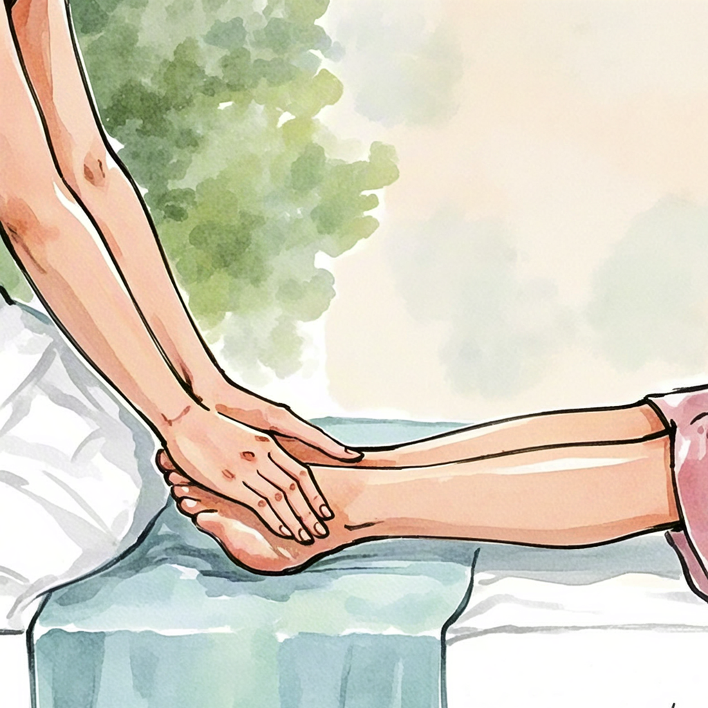 Gentle nature watercolor scene with grass, sunlight, and foot massage.
