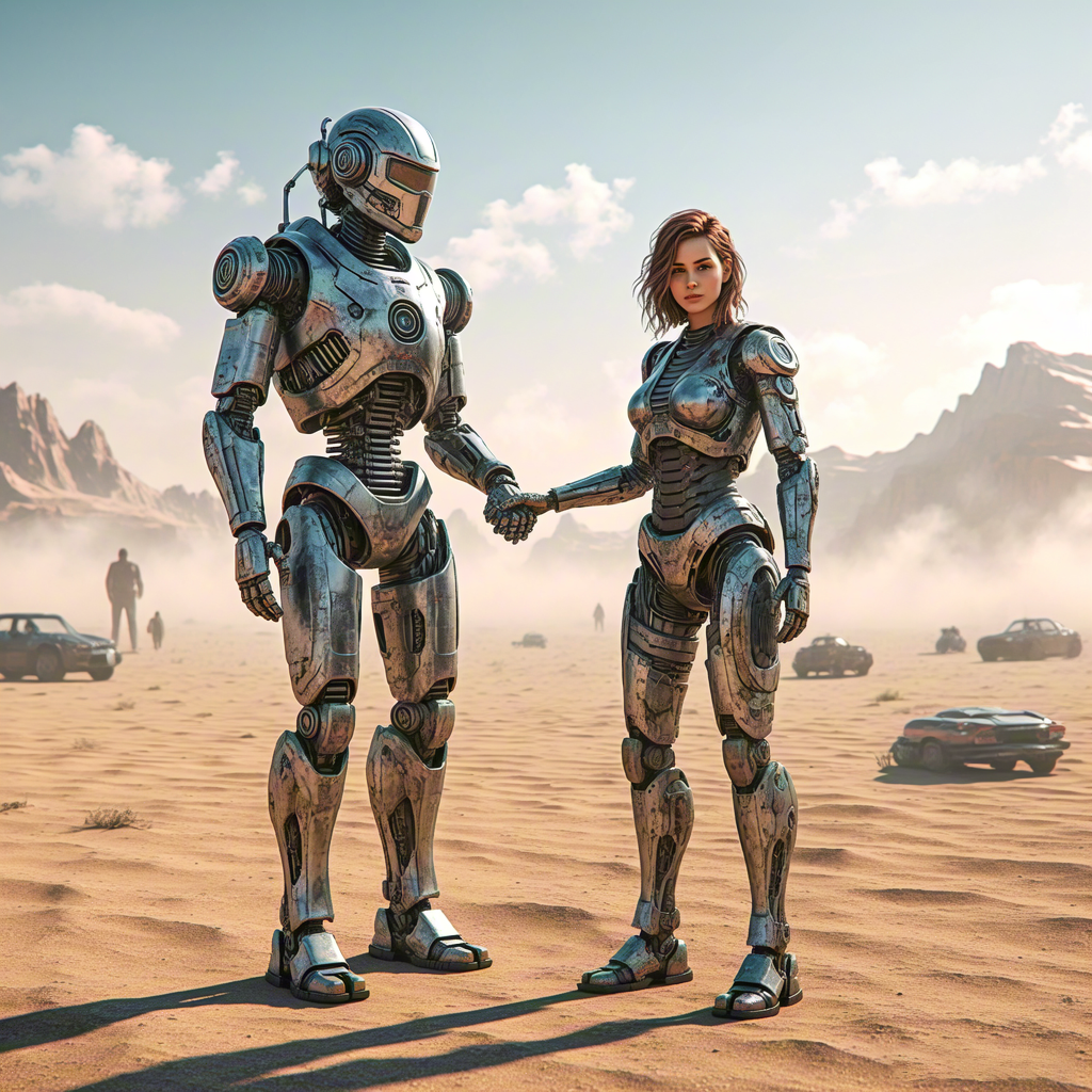 Minimal sci-fi scene of a man interacting with small robot on sandy beach