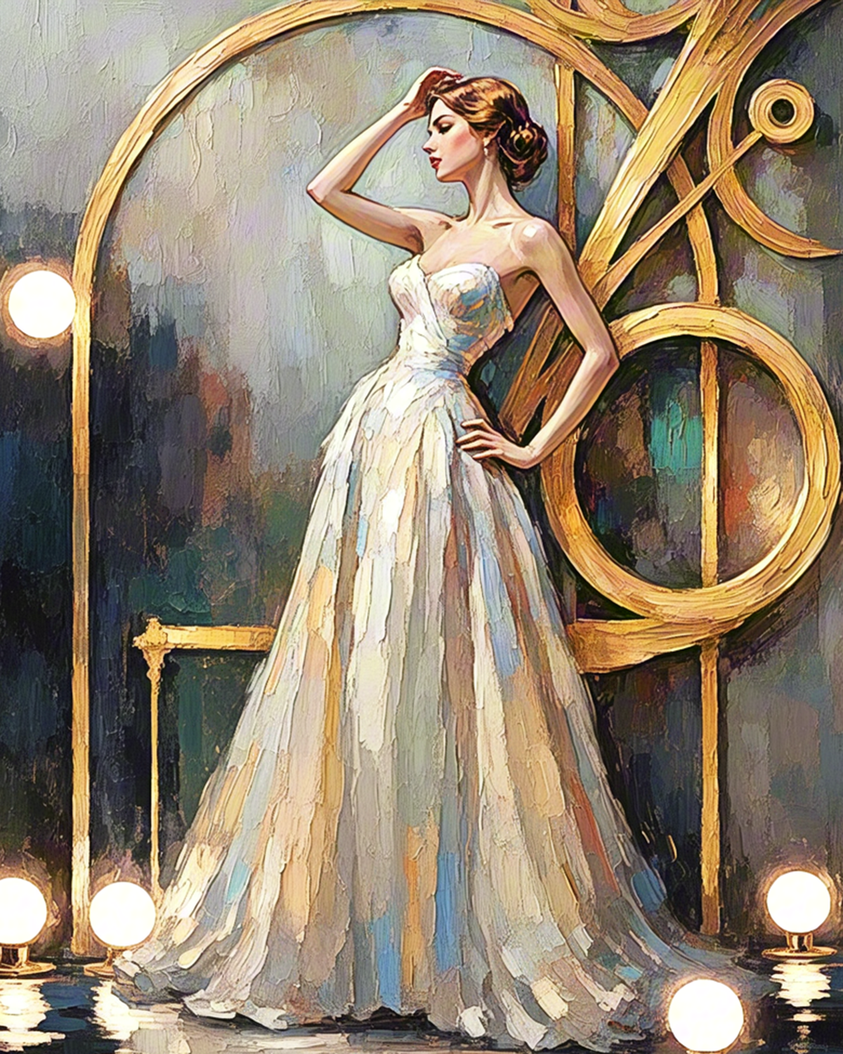 Elegant stylized painting of woman in white dress with decorative golden elements