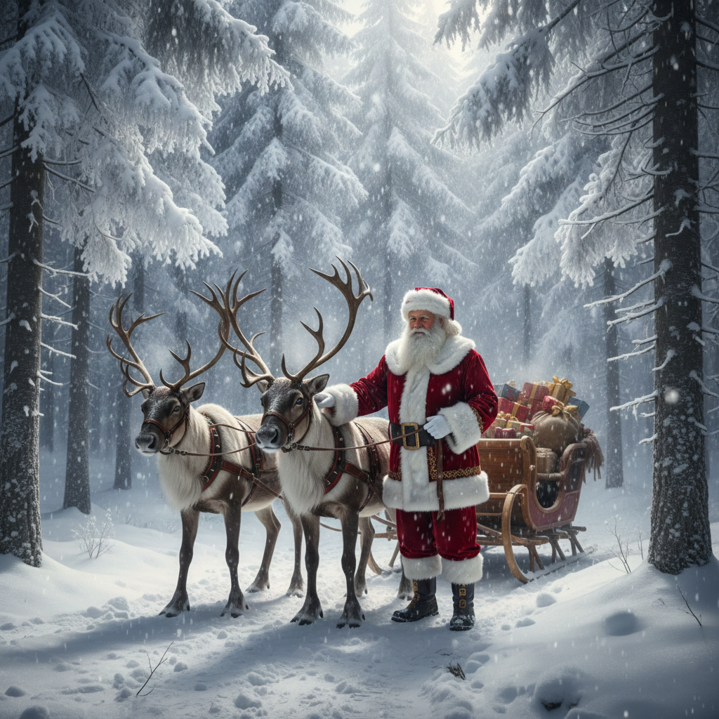 Santa Claus and reindeer standing in snowy forest with gifts