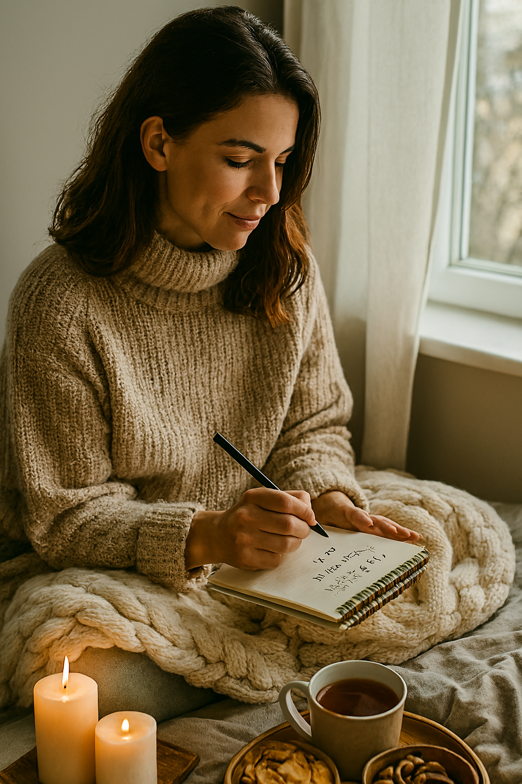 Woman writing in notebook with candles and warm blanket by window