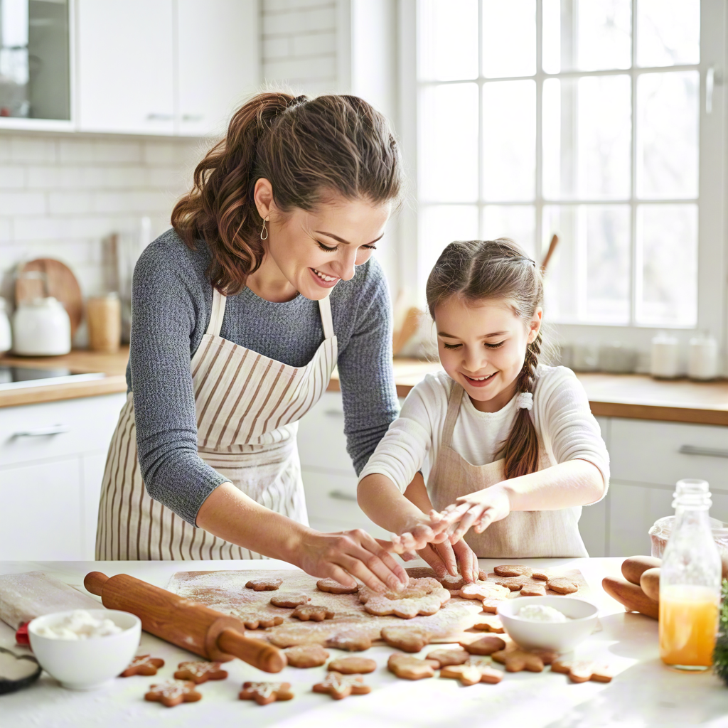 Mom and daughter making Christmas cookies together in warm kitchen
