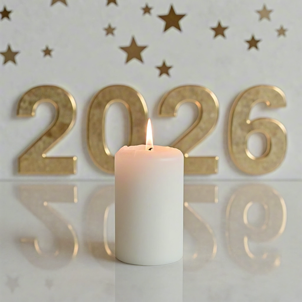 White candle in front of golden 2026 numbers and star decorations