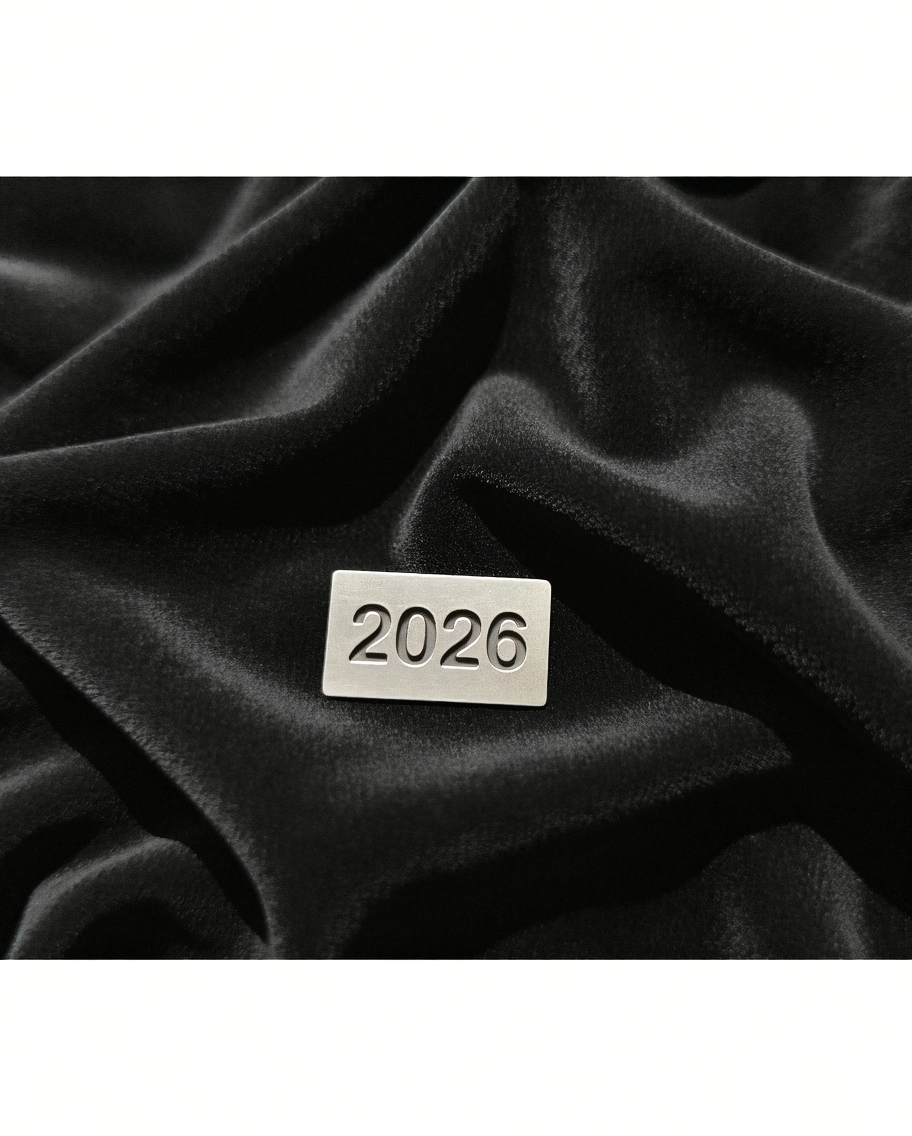 Metallic 2026 label on smooth black velvet fabric
