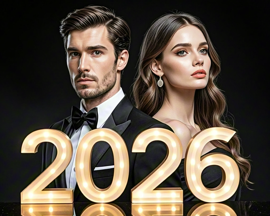 Fashion couple standing with glowing 2026 numbers in dark background
