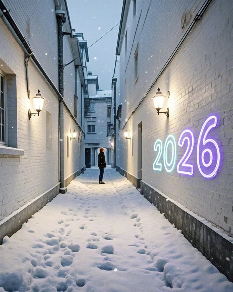 Narrow snowy street with glowing 2026 neon sign on wall