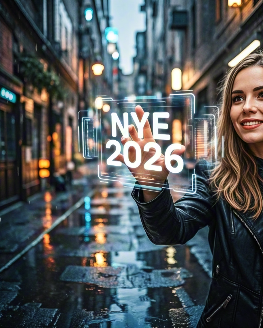 Smiling woman holding NYE 2026 light sign in night city street