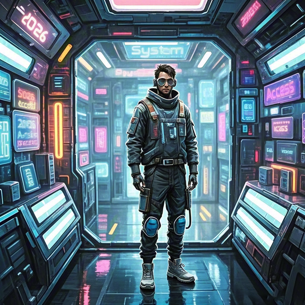 Futuristic man in high-tech suit standing in neon sci-fi corridor