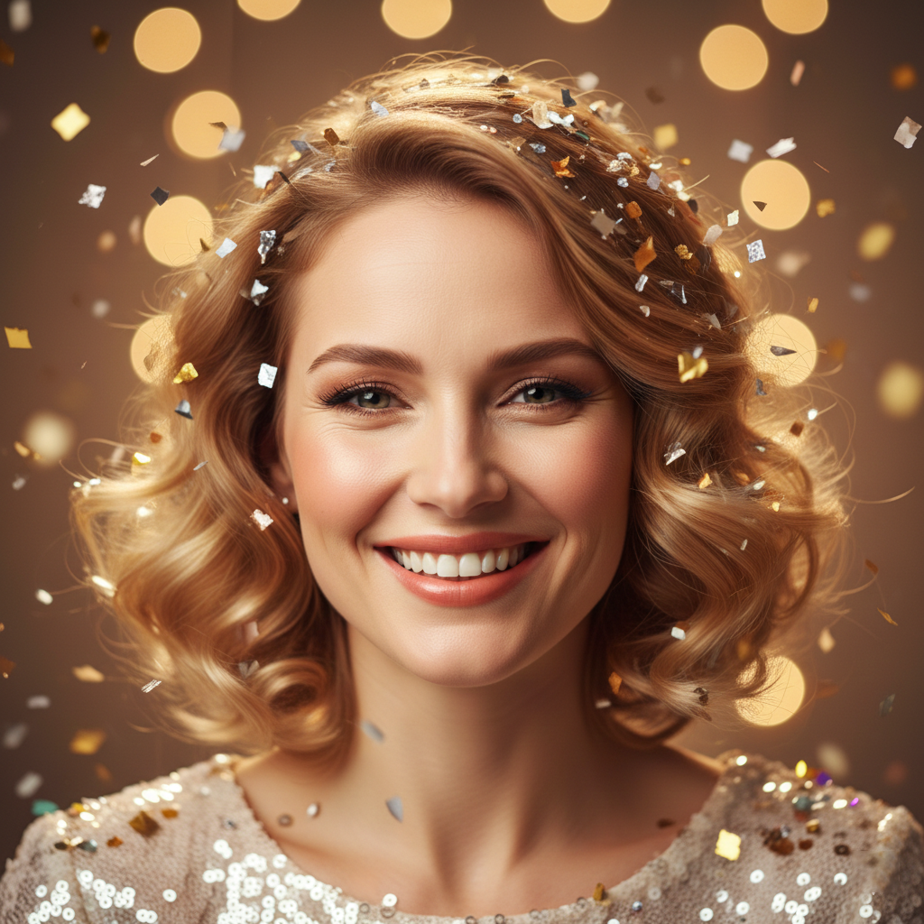 Woman in red festive dress smiling with golden confetti falling around her