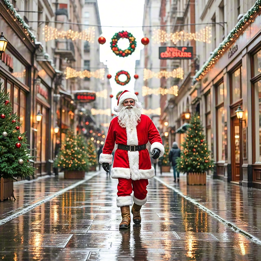 Christmas-themed image of Santa walking in a decorated pedestrian street with lights.
