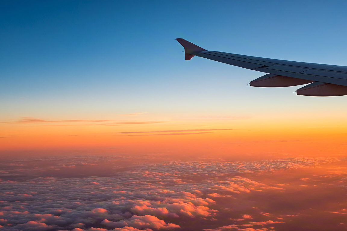 View from airplane window during sunset