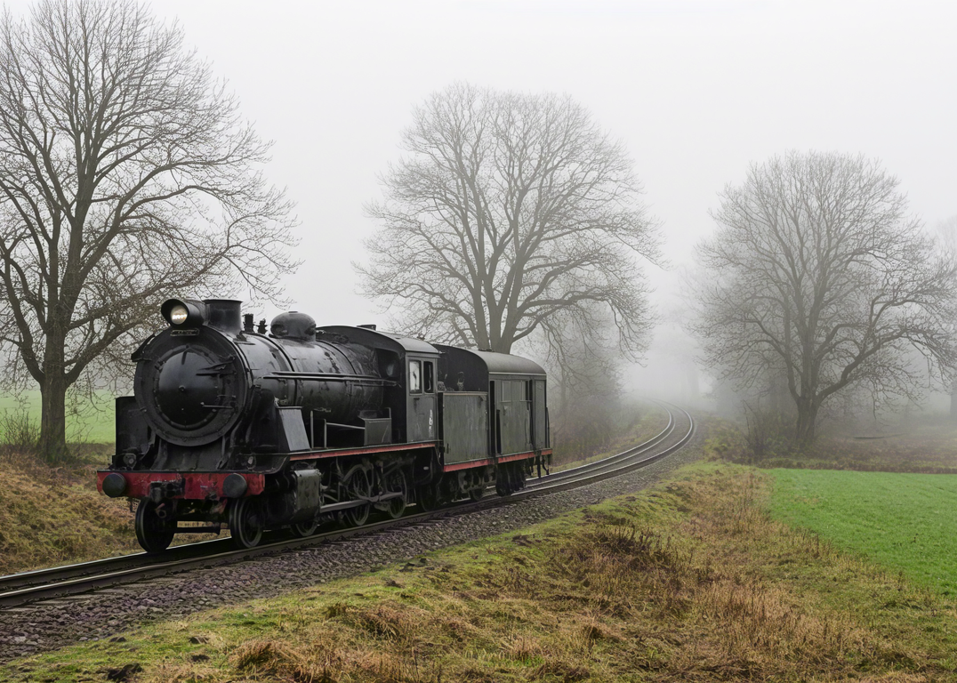 Old steam train in foggy countryside