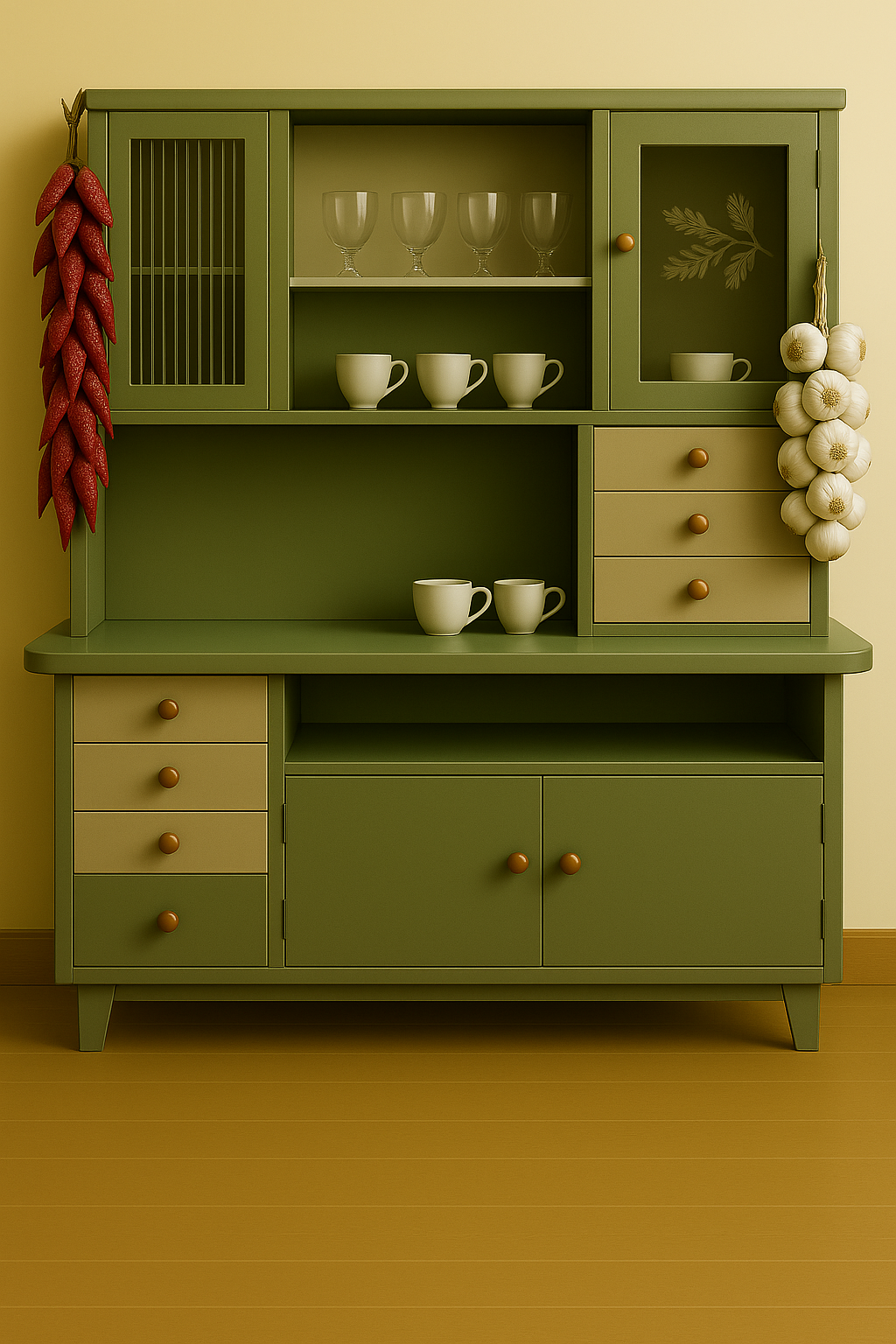 Vintage green wooden cupboard with shelves, tableware and hanging decor.