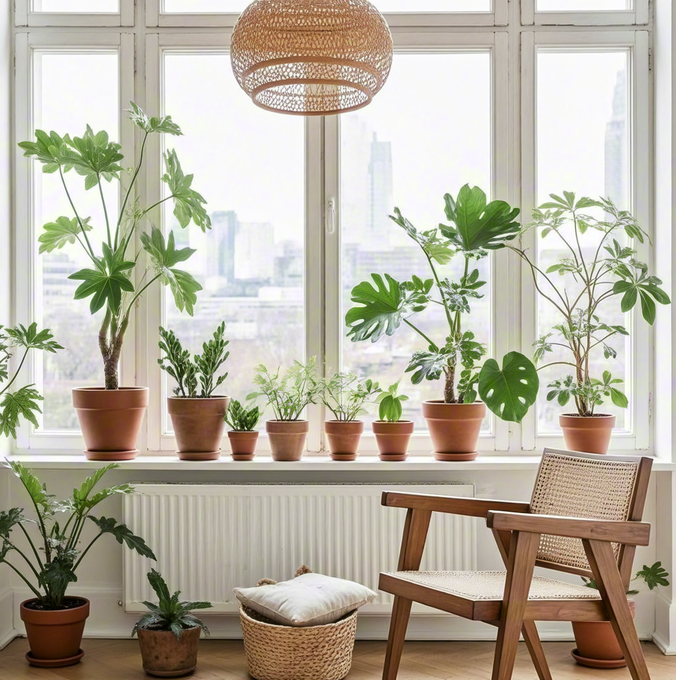 cozy interior with potted plants by a window