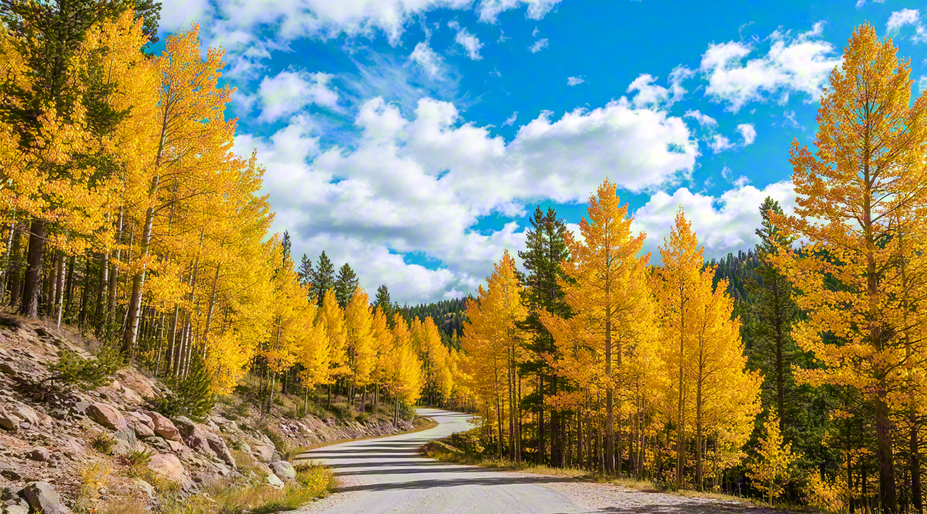 Beautiful fall landscape with yellow leaves and clear blue sky along the road.