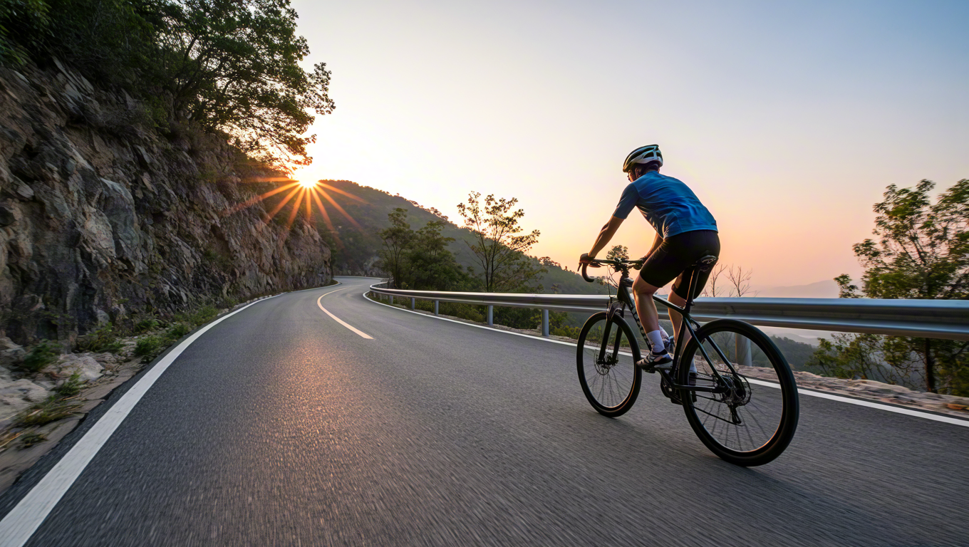 Athlete cycling on scenic road during warm sunset light