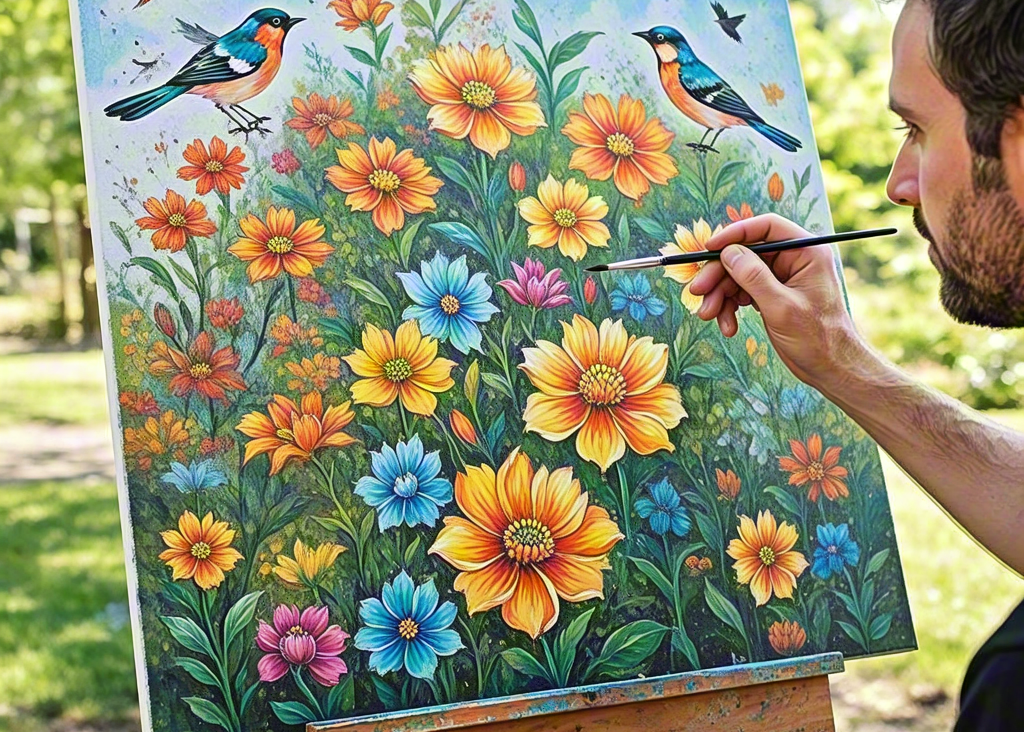 Male painter creating vibrant floral artwork in nature