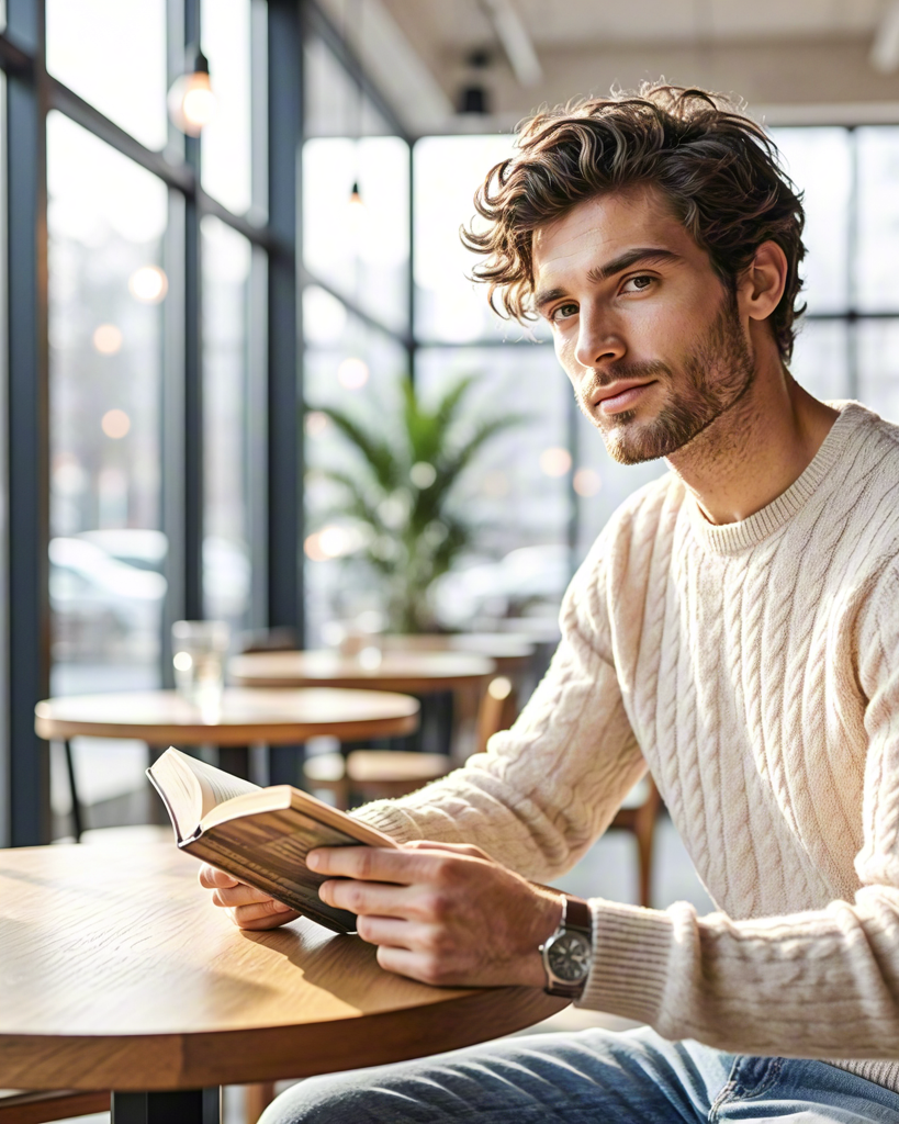 Casual scene of a man reading a book at a wooden table inside a warm, modern café.