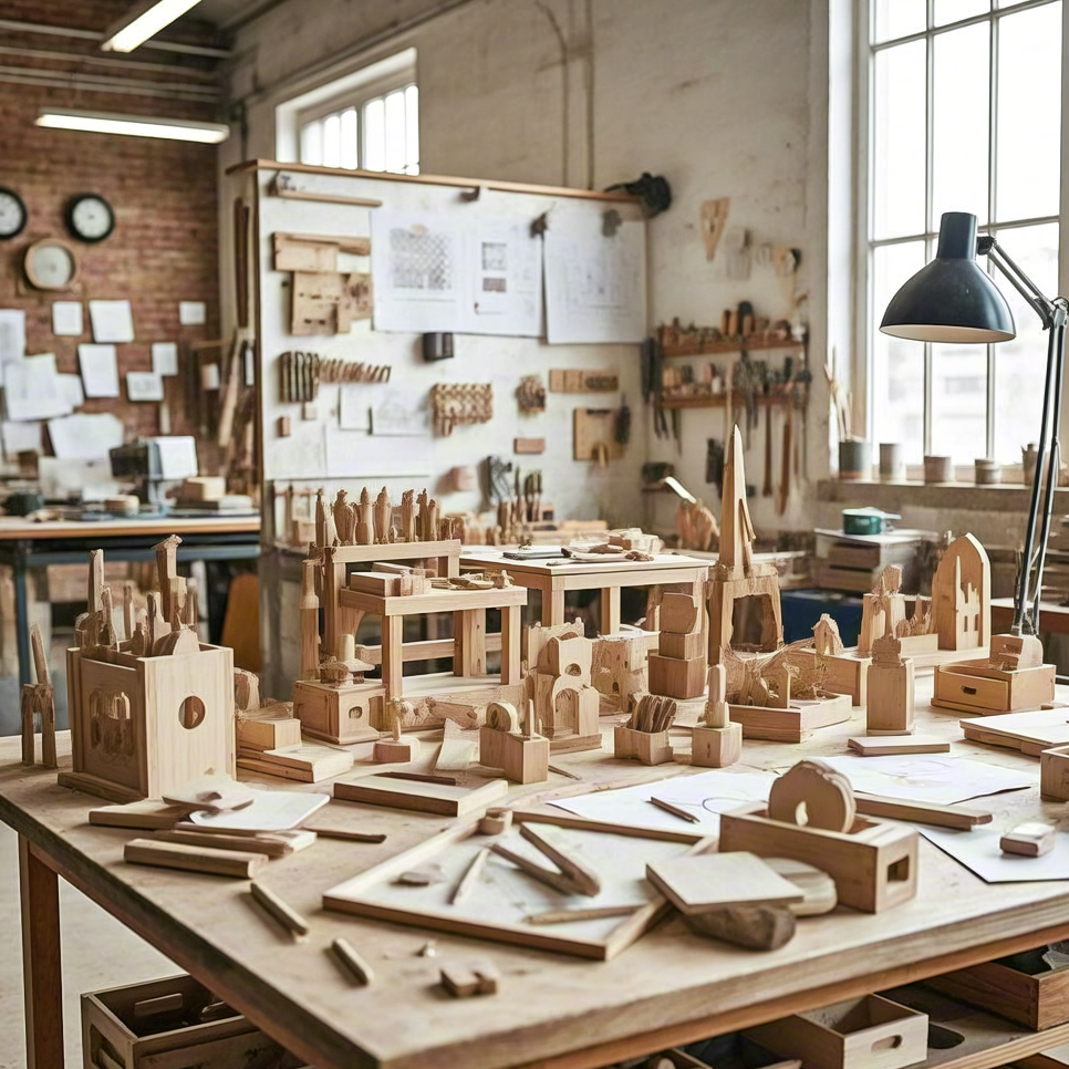 Creative woodworking studio with architectural models – craft and design workspace