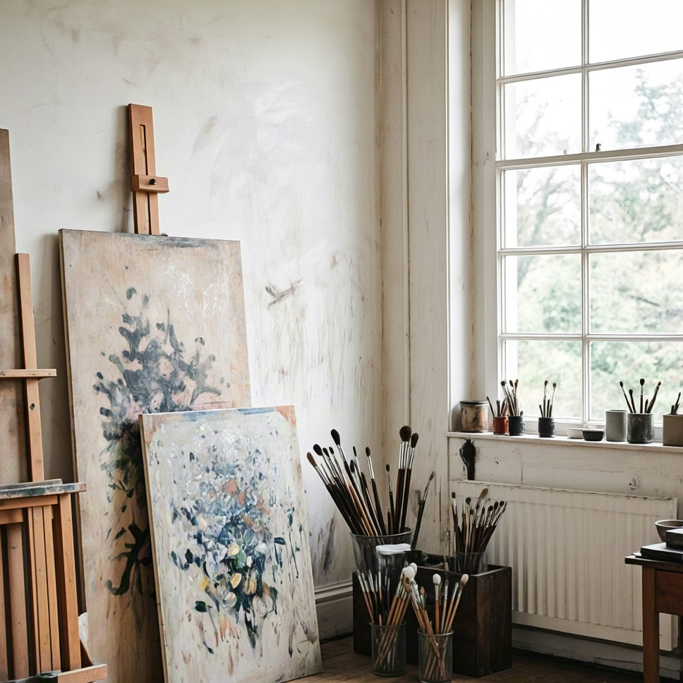 Artistic studio corner with abstract paintings on wall, jars of paintbrushes, and natural light from window