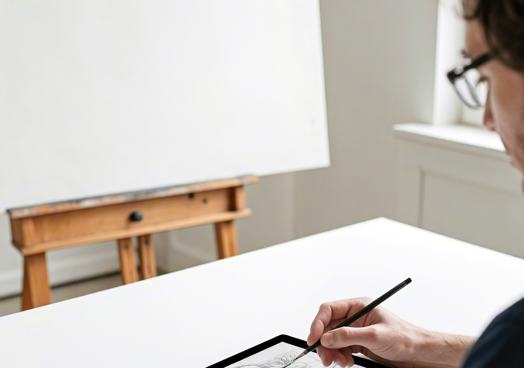 Artist sketching on digital tablet in creative workspace