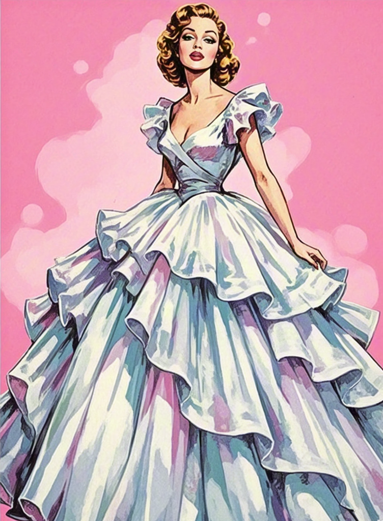 Elegant illustrated woman wearing ruffled pink gown in fairytale style