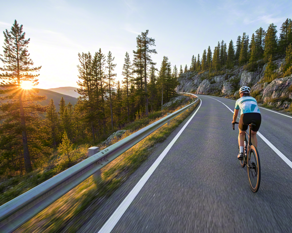 Cyclist riding on an empty road through forest landscape during sunset