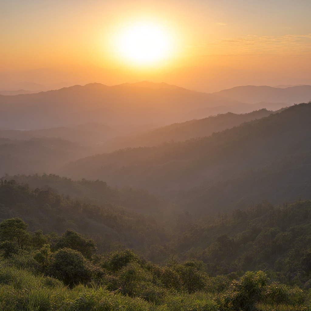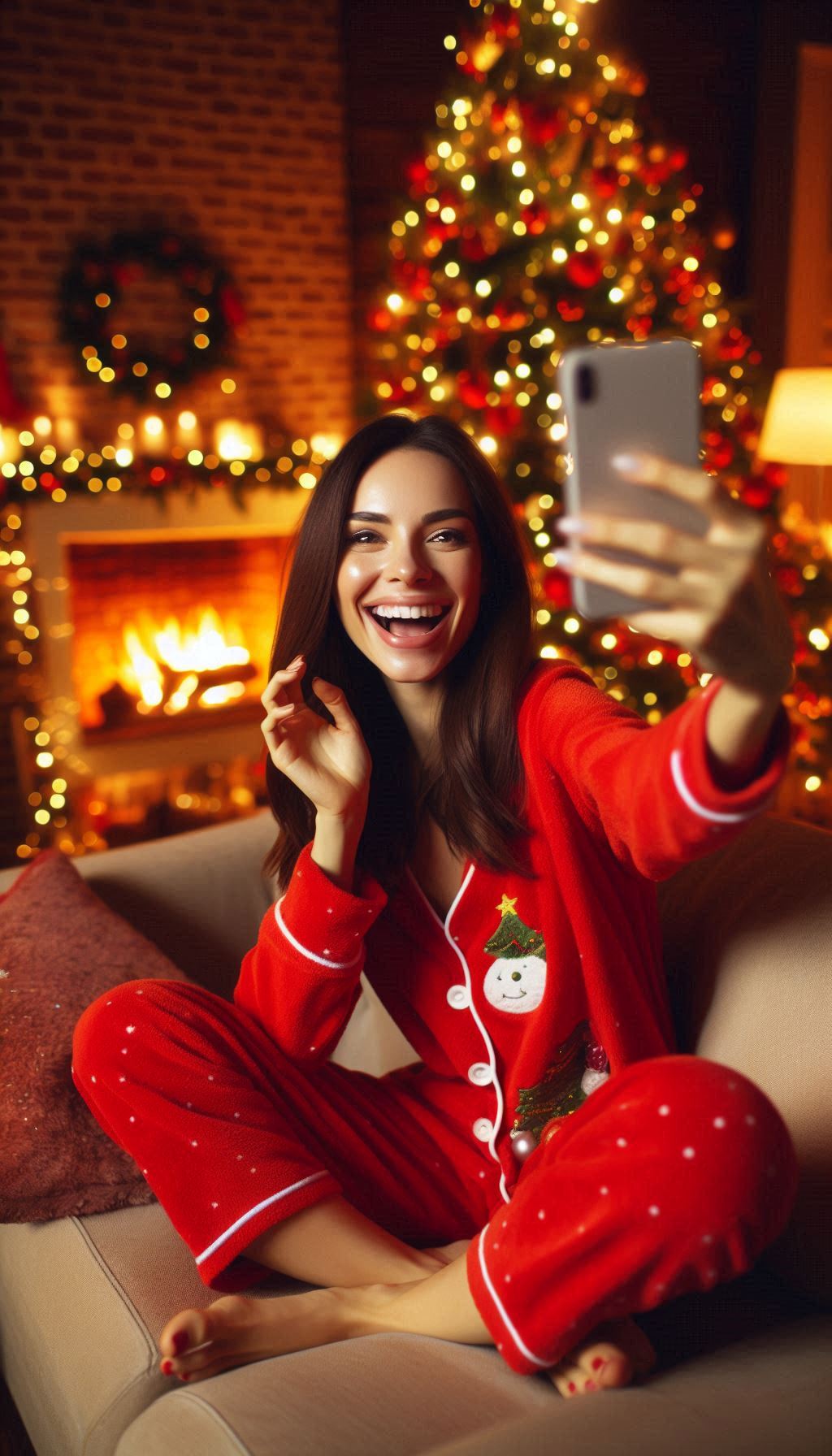 Smiling woman in red pajamas sitting by Christmas tree with lights