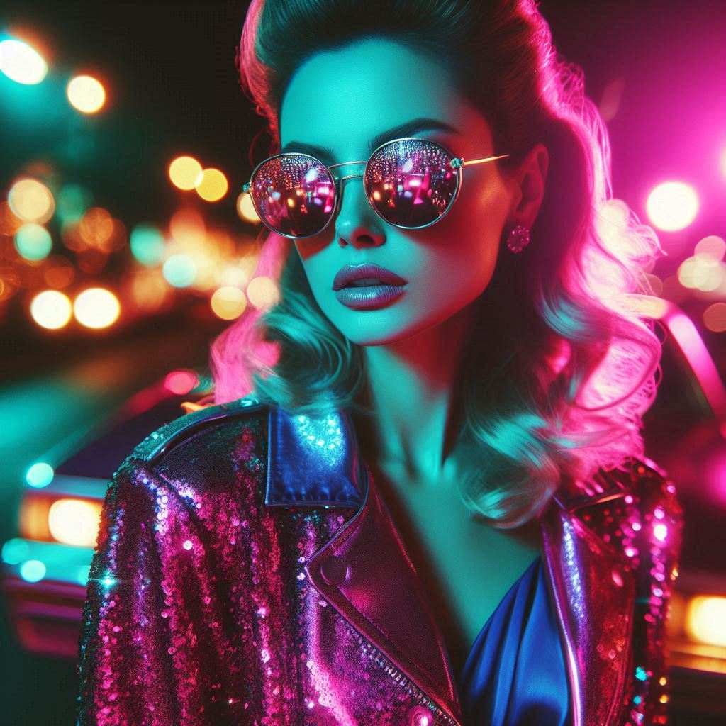 Stylish woman in sequin jacket and bright neon lighting wearing sunglasses