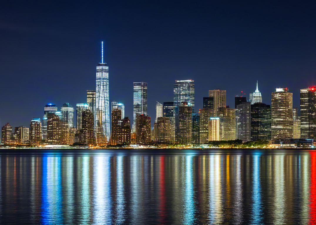 Downtown city lights reflecting on lake at night