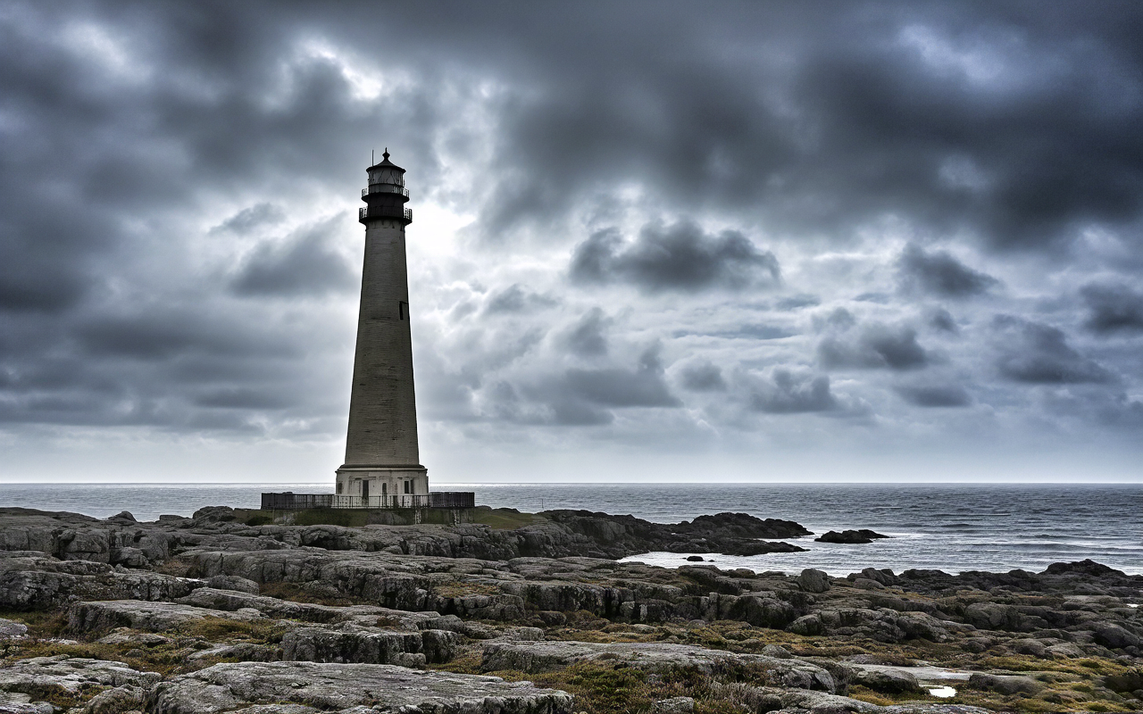 Lighthouse standing against stormy sea under dark dramatic clouds