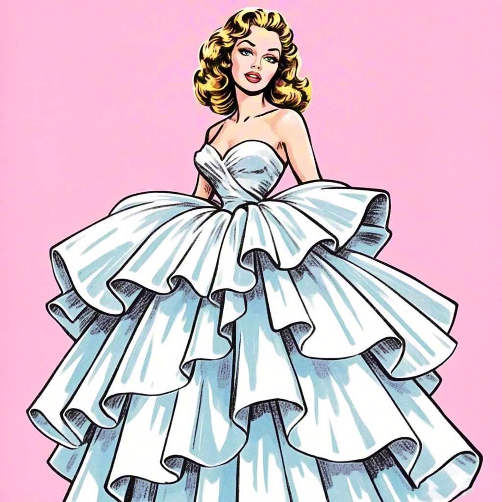 Artistic illustration of a woman wearing a large layered ruffled dress.